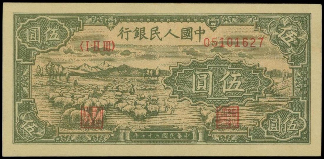 People’s Bank of China, 1st series renminbi, 5 yuan, 1948, serial number I II III 05101627, ‘Sheep’,