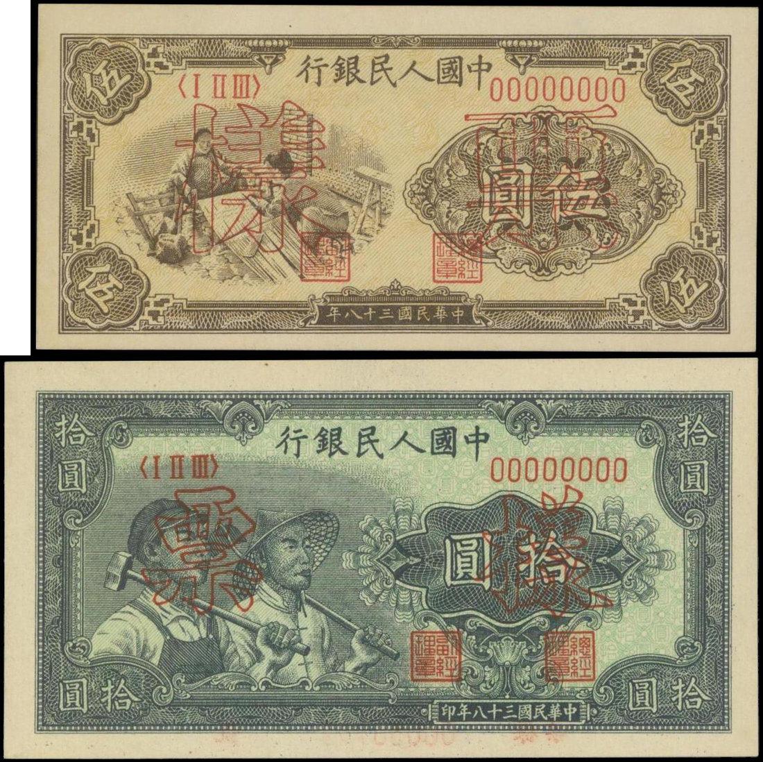 People's Bank of China, 1st series renminbi, 1948-1949, lot of 2 specimens, 5 yuan 'Weaving' and 10 yuan 'Farmer and Factory Worker', control numbers 50331 and 50776,