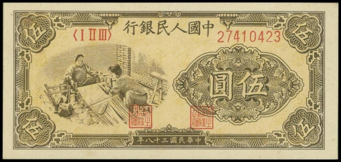 People’s Bank of China, 1st series renminbi, 5 yuan, 1949, serial number I II III 27410423, ‘Weaving’,