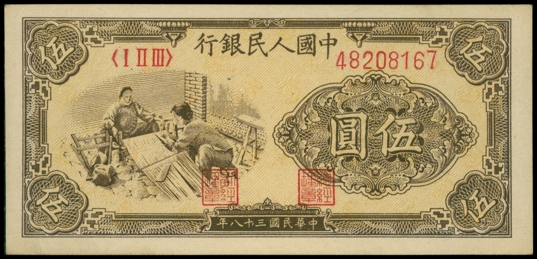 People's Bank of China, 1st series renminbi, 5 yuan, 1949, 'Weaving', serial number 48208167,
