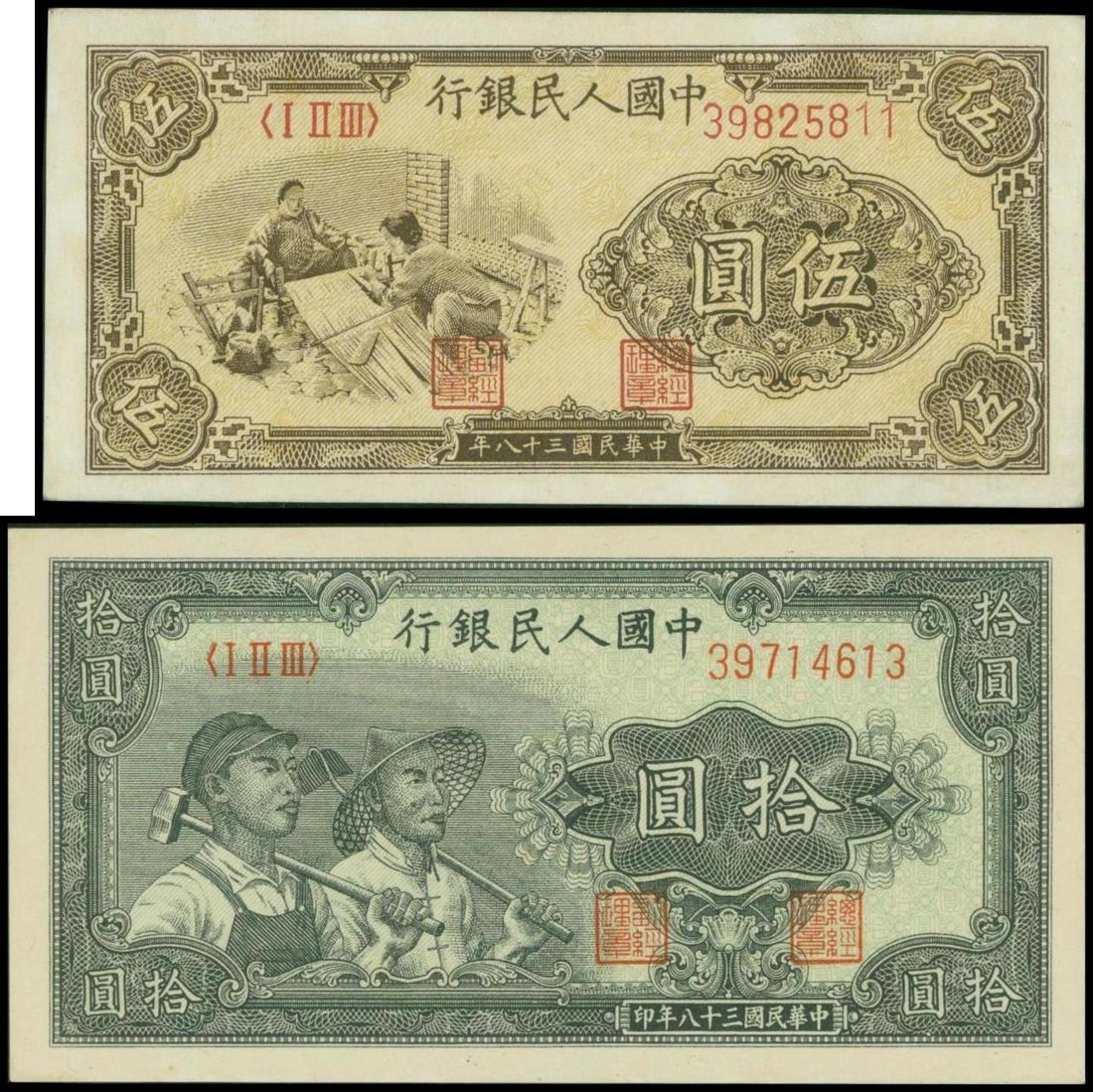 People's Bank of China, 1st series renminbi, 1948-1949, lot of 2: 5 yuan, 'Weaving', serial number I II III 39825811 and 10 yuan 'Farmer and Factory' serial number I II III 39714613,