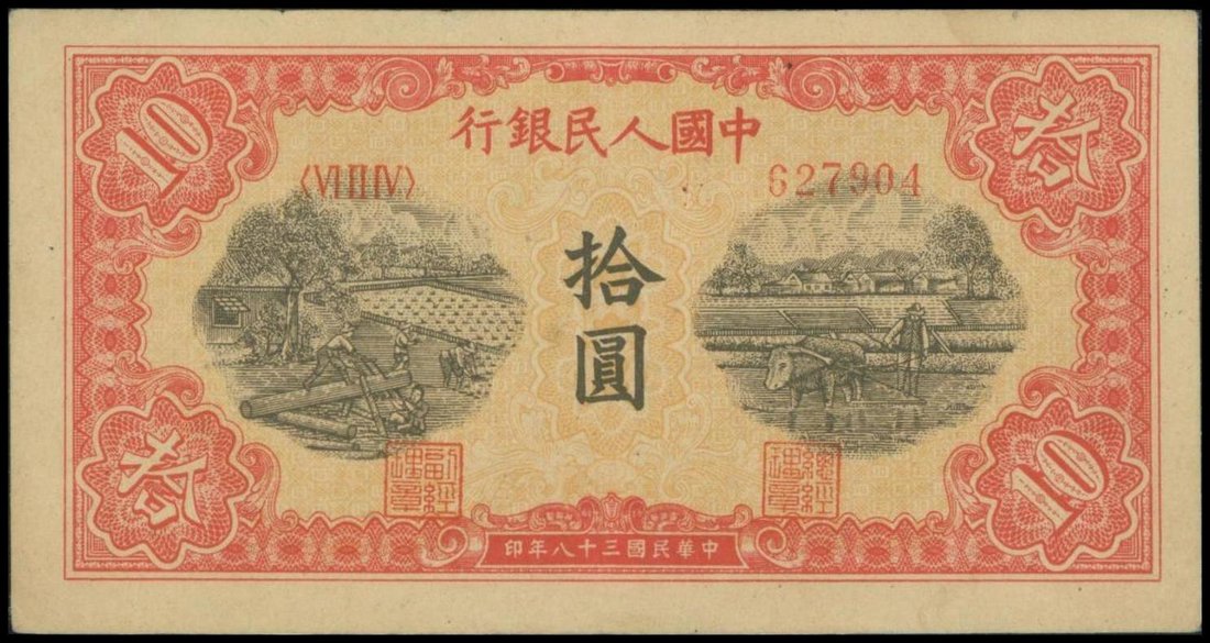 People’s Bank of China, 1st series renminbi, 10 yuan, 1949, serial number VI II IV 627904, ‘Wood Sawing and Ploughing’,