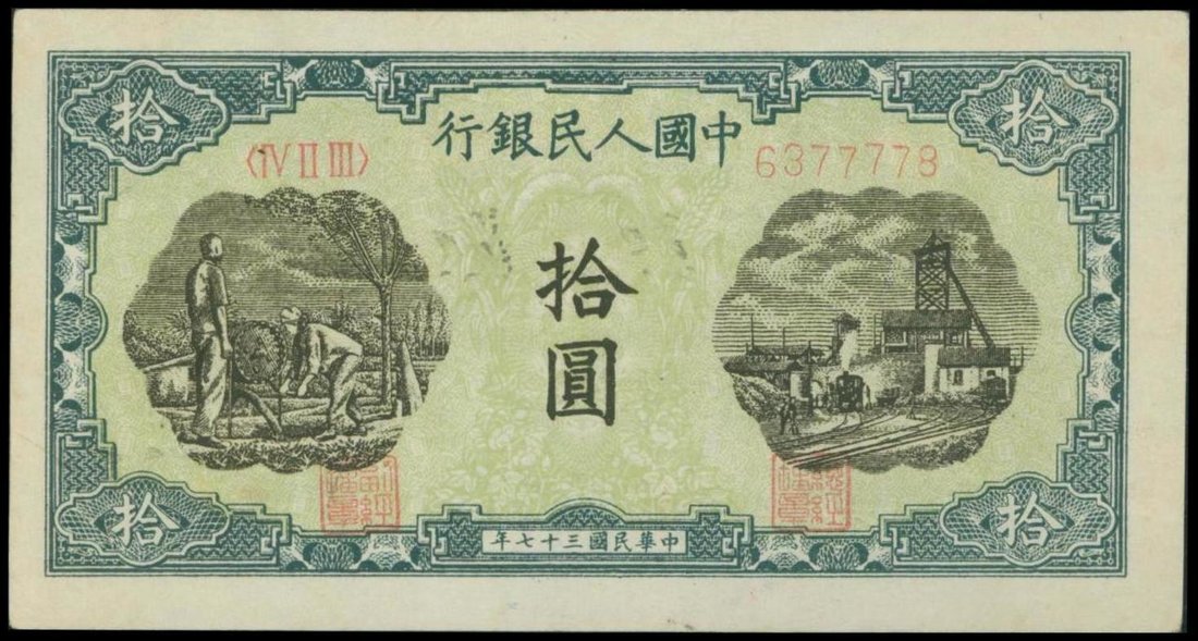 People’s Bank of China, 1st series renminbi, 10 yuan, 1948, serial number IV II III 6377778, ‘Well Digging’,