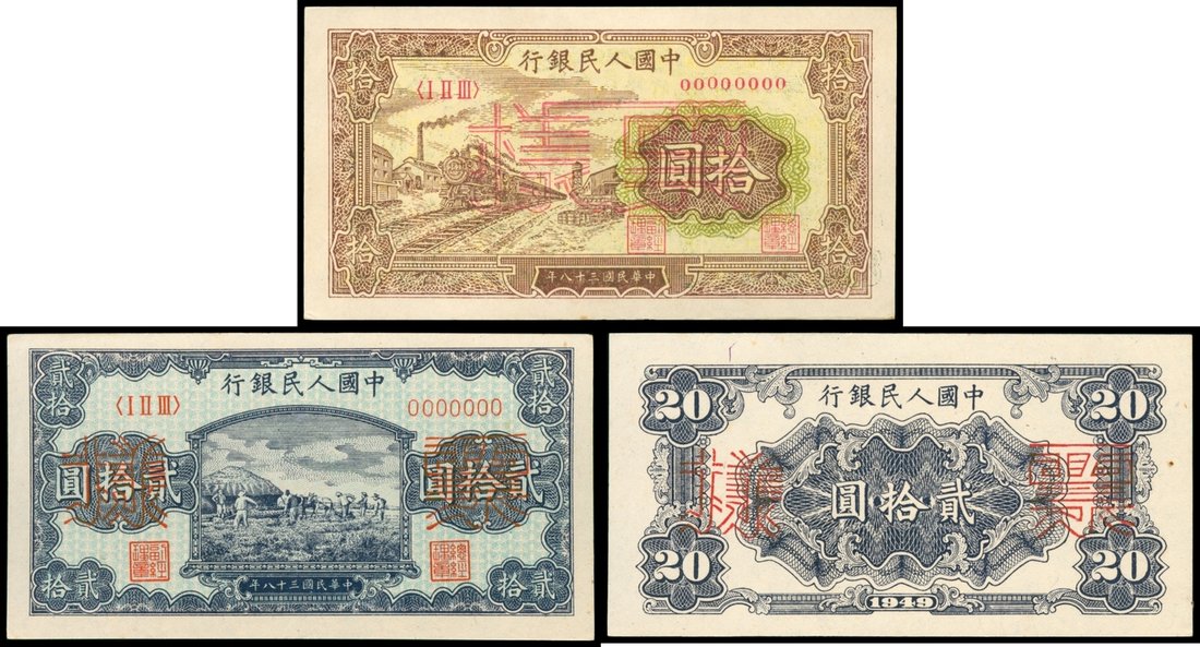 People’s Bank of China, 1st series reminbi, specimen note of 10 yuan and uniface obverse and reverse specimen of 20 yuan, 1949, ‘Yellow Train’, control number 015647, ‘Agricultural Occupations’, control number 13633, red “SPECIMEN” in Chinese overprinted at centre,