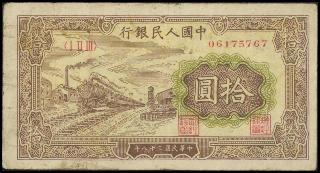 People’s Bank of China, 1st series renminbi, 10 yuan, 1949, serial number I II III 06175767, ‘Yellow Train’,