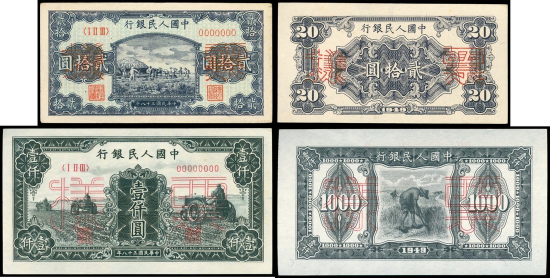 People’s Bank of China, 1st series reminbi, 20 yuan and 1000 yuan, 1949, uniface obverse and reverse specimen, ‘Agricultural Occupations’, control number 13605, ‘Three Tractors’, control number 00020931, red “SPECIMEN” in Chinese overprinted at centre,