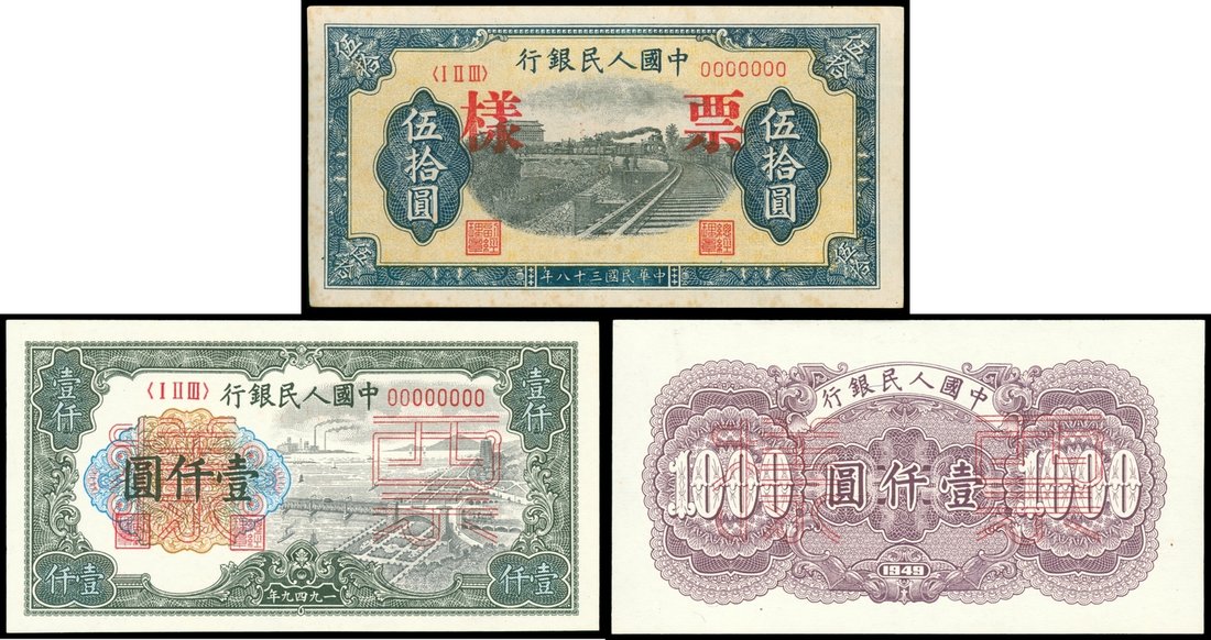 People’s Bank of China, 1st series reminbi, specimen note of 50 yuan and uniface obverse and reverse specimen of 1000 yuan, 1949, ‘Train’, control number 19433, and ‘Qiantang Bridge’, control number 00043578, “SPECIMEN” in Chinese overprinted in red,