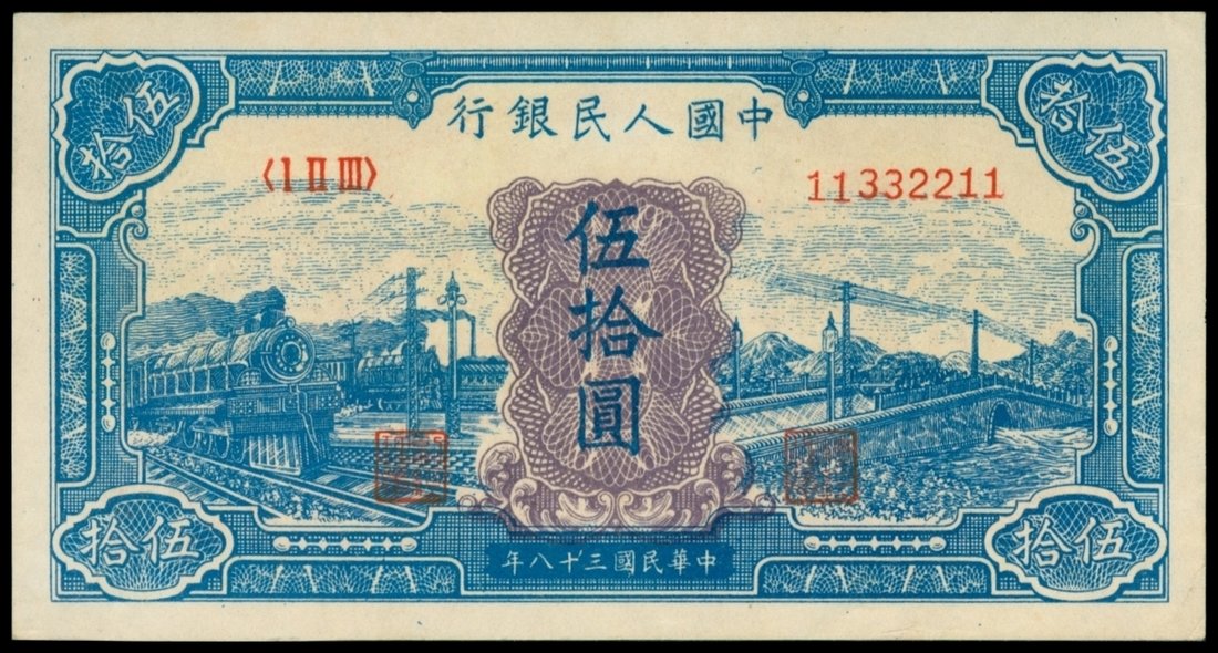 People's Bank of China, 1st series renminbi 1948-49, 50 yuan, 'Blue Train', serial number 11332211,
