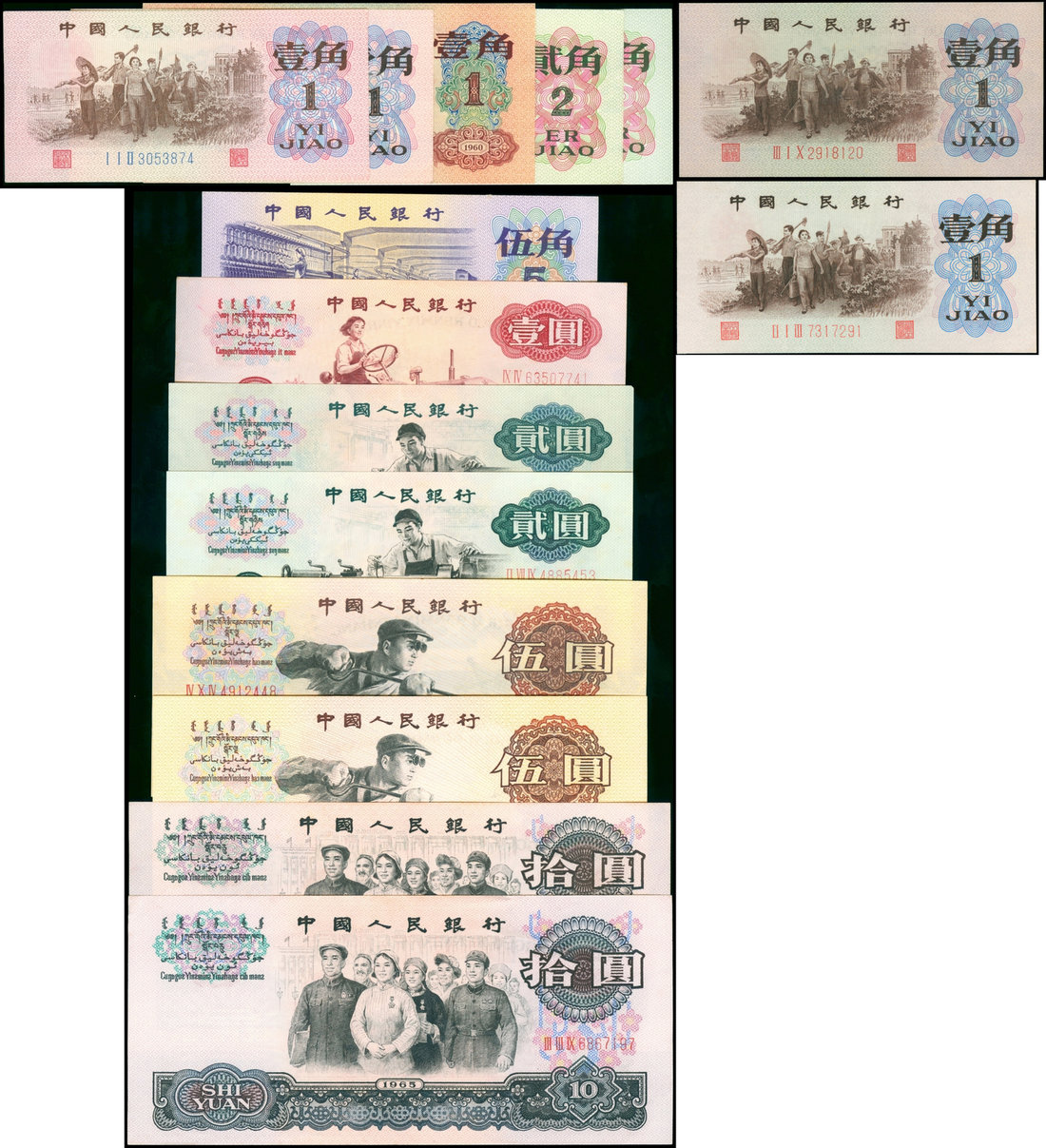 People's Bank of China, 3rd series renminbi, 1960-1972, a group of 15 notes which nearly represents the complete denominations, prefix and watermark types, of note there is the 1960 red 1 jiao, the 1962 1 jiao green reverse with the STAR WATERMARK and the 1 jiao green reverse without the watermark,