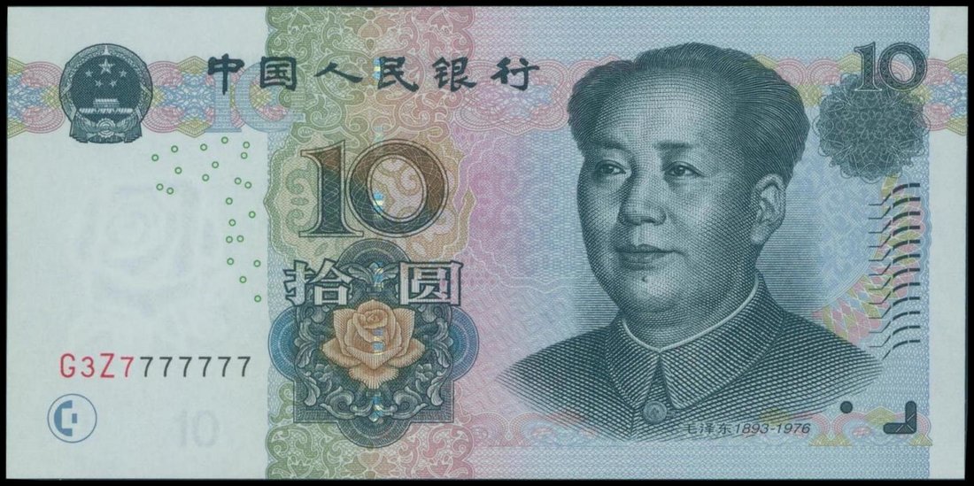 People's Bank of China, 10 yuan, 2005, solid number G3Z 7777777, blue green on multicolour underprint, Maozedong at right,