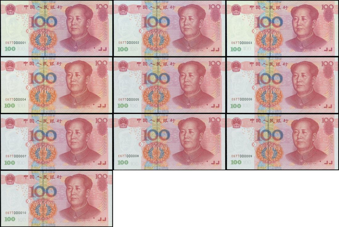 People’s Bank of China, a set of 10 consecutive notes, all 100 yuan, 2005, identical prefix of E67T and serial numbers of 000001-10, red and multicolour, Mao Zedong at right,