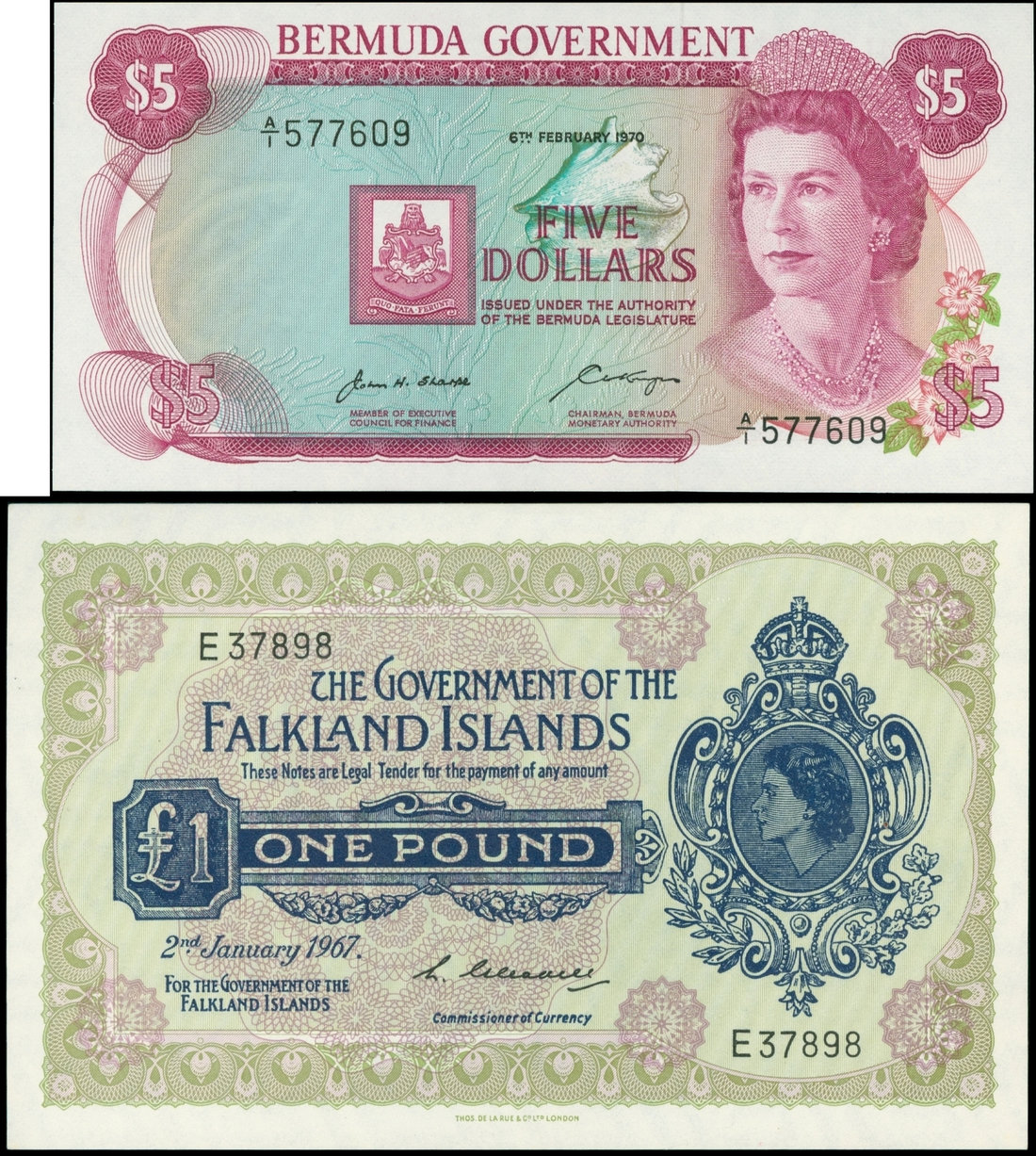 British Administration, Bermuda $5, 1970 and Falkland Islands ?1, 1967, serial number A/1577609 and E37898 respectively, Elizabeth II at right,