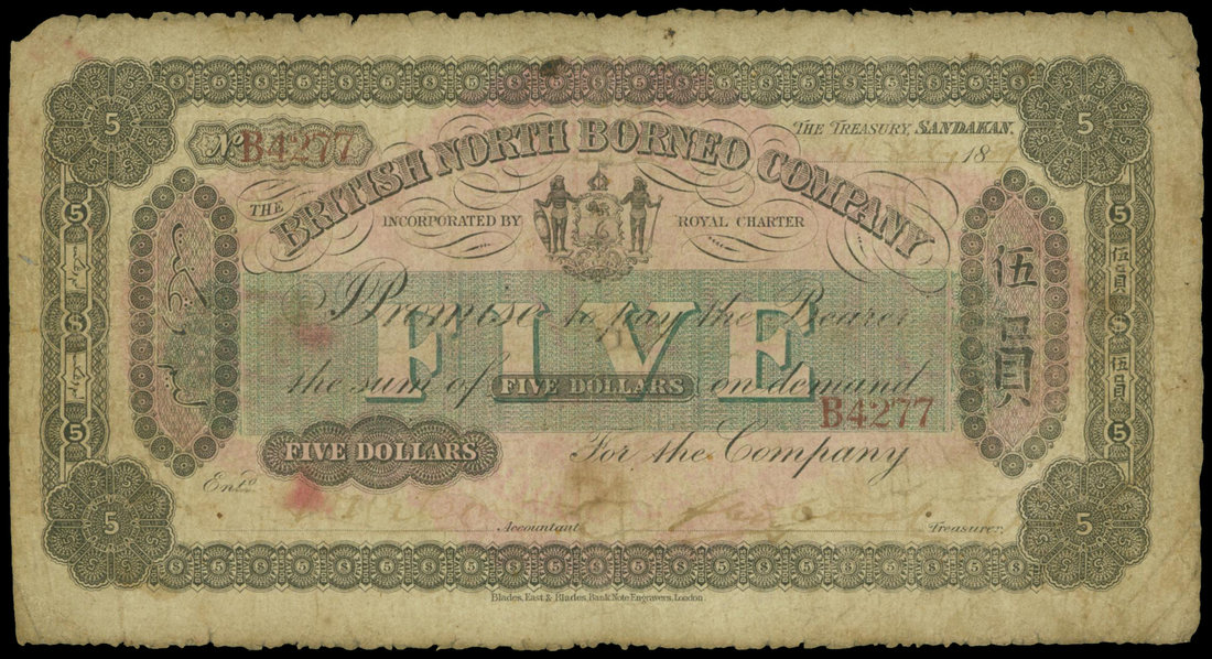 The British North Borneo Company, $5, 1889, serial number B4277, ornate black border, state arms at upper centre, 'FIVE' in green at centre, two handsigned signatures at bottom, reverse pink, bank title and denomination in English,