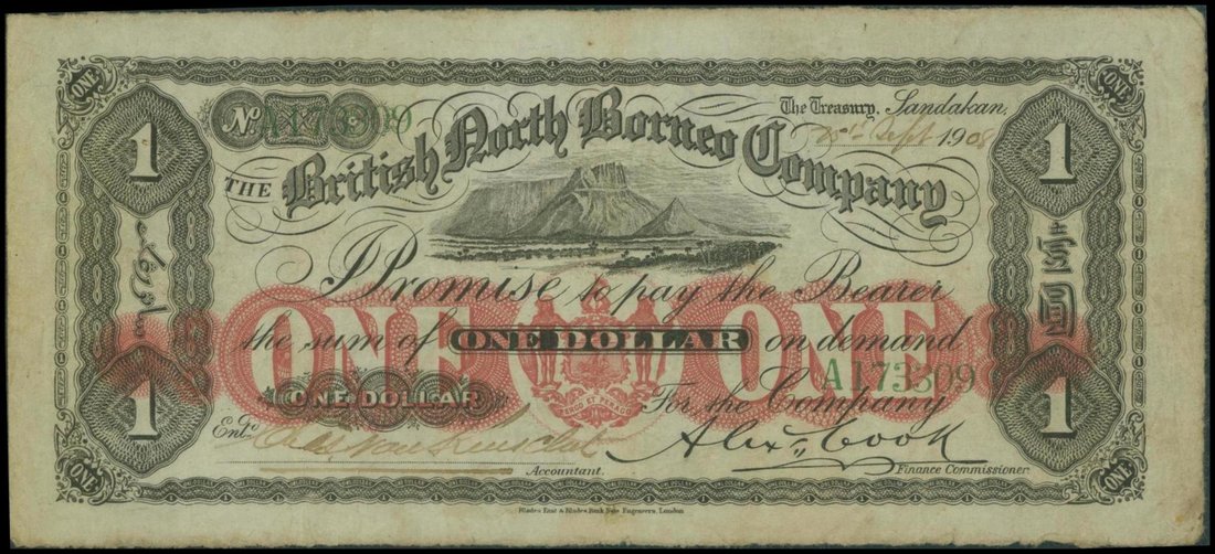 British North Borneo Company, $1, 25.09.1908, red serial A173309, black and pink, Mount Kinabalu at centre, clear handsigned signature at bottom left,