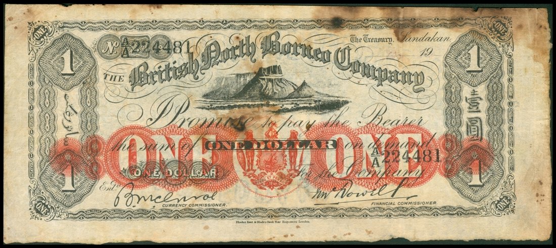 British North Borneo, $1, ND(1886-1920), serial number A/A 224481, Mount Kinabalu at top centre,