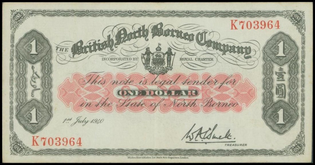British North Borneo Company, $1, 1940, red serial K703964, Black and pink, pink rosette at centre,