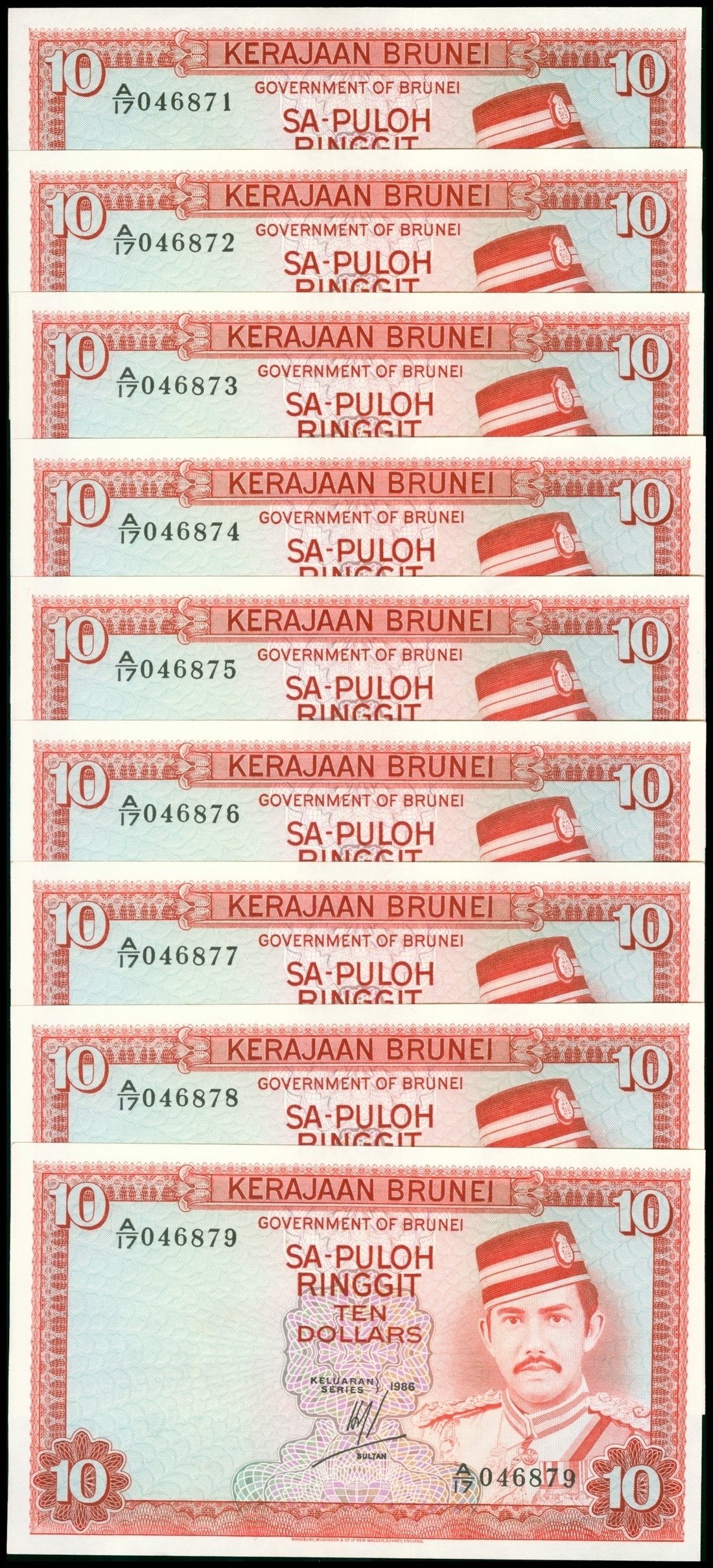 Brunei, $10, consecutive 9 pieces, 1986, serial number A/17 046871-9, red-orange on light blue, Sultan Bolkiah at right, reverse red-orange, Mosque at centre,
