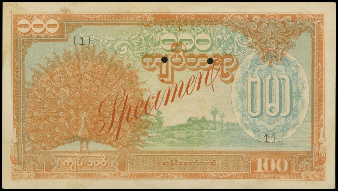 Burma, a specimen for 100 kyats, no date (1944), block serial number [1], orage on blue and green, peacock at left, reverse orange, scene at Mandalay, two small official perforated holes, 'SPECIMEN' in red overprint,