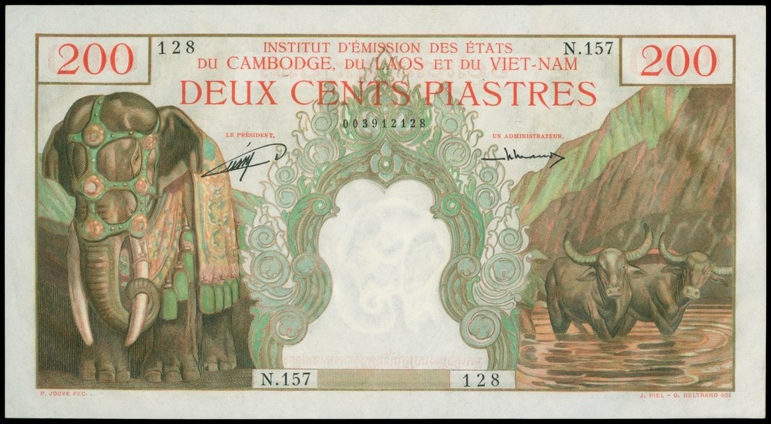 French Indo China (Cambodia issue), 200 piastres, no date (1953), serial number N.157 128, large size notes, multicolour, adorned elephant at left, two buffaloes at right, elephant watermark at bottom centre, rock carving on reverse,