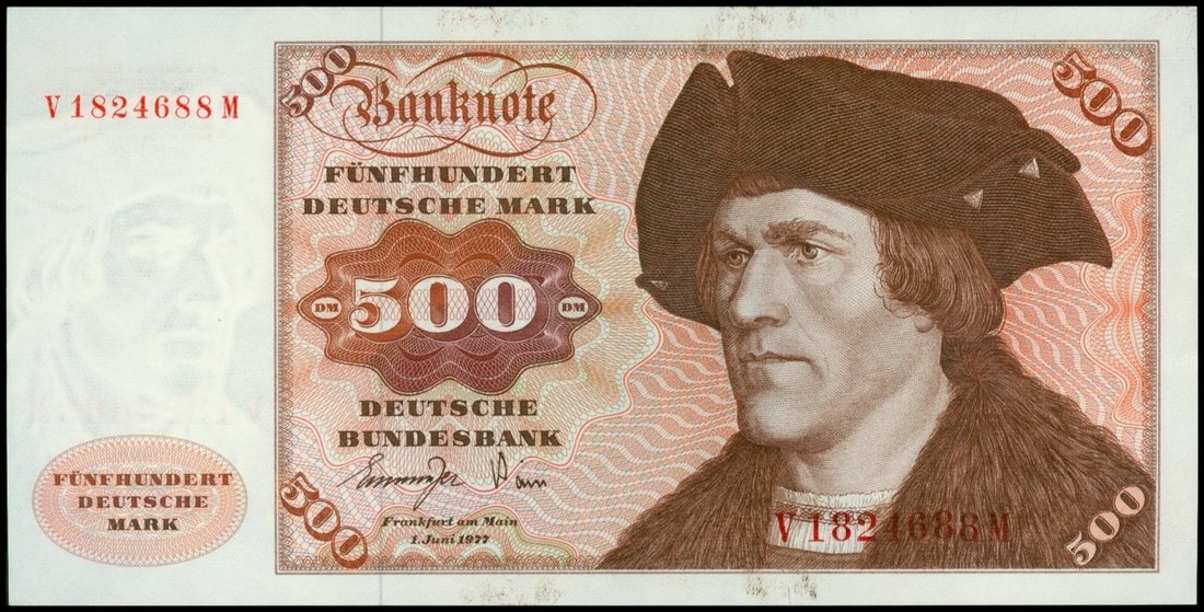 Deutsche Bundesbank, 500 Deutsche Mark, 1977, red serial V1824688M, red, brown and multicoloured, 'Portrait of a Man Without Beard' at right, reverse Eltz castle at centre,