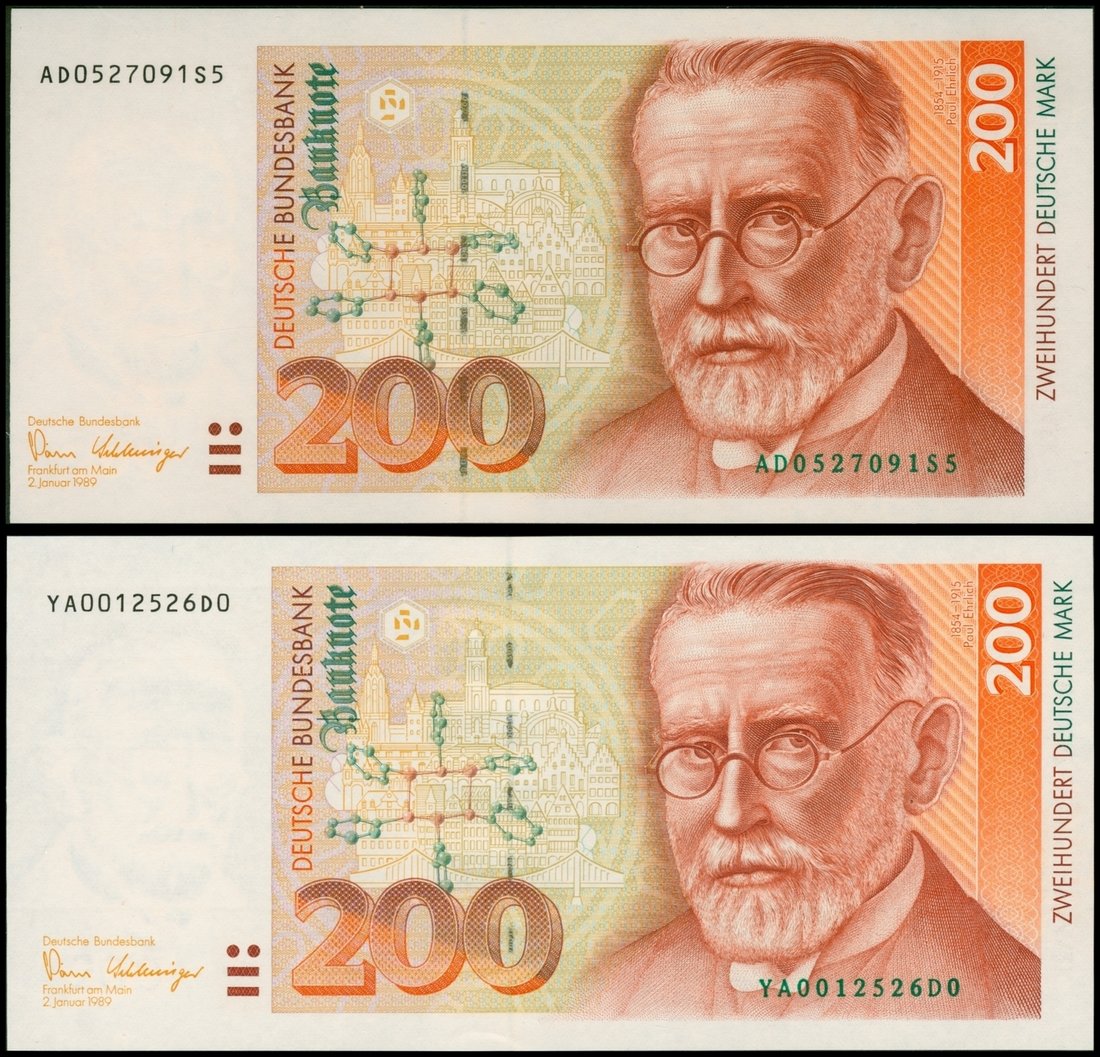 Deutsche Bundesbank, a pair of normal and replacement 200 Deutsche Mark, 1989, serial number YA0012526D0 and AD0527091S5, orange, green and multicoloured, Paul Ehrlich at right, microscope on reverse,