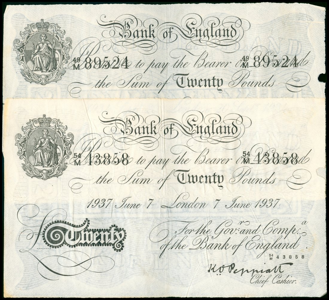 Great Britain, a pair of Bernhard forgery 20 pounds, 1934 and 1937, serial number 49M 89524 and 54M 43858, Britannia at top left,