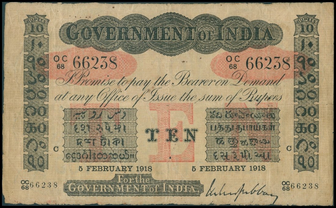 India, 10 rupees, 1918, serial number CC68 66238, black and red on white, reverse blank,