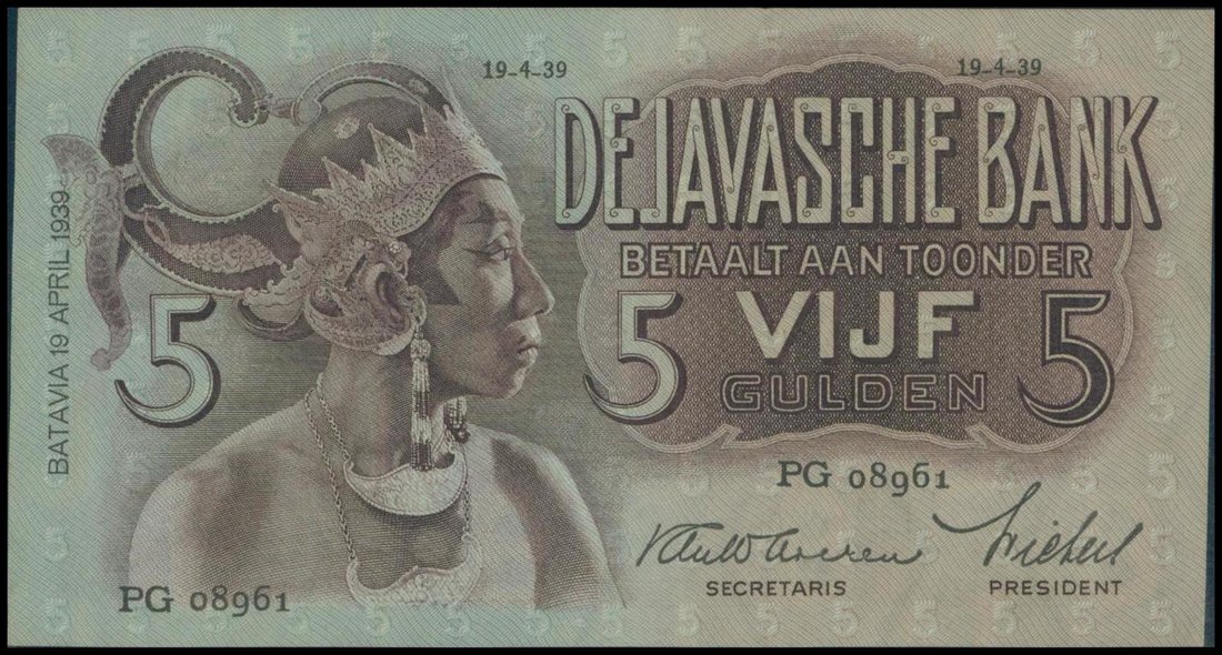 Netherlands Indies, Javasche Bank, 5 gulden, 19.4.1939, black serial PG08961, blue and brown, Javanese dancer at left, rosette on reverse,