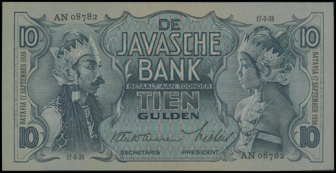 Netherlands Indies, Javasche Bank, 10 gulden, 17.9.1938, black serial AN08782, blue and red, Javanese dancers on obverse, rosette on reverse, a scarce signature combinaation,