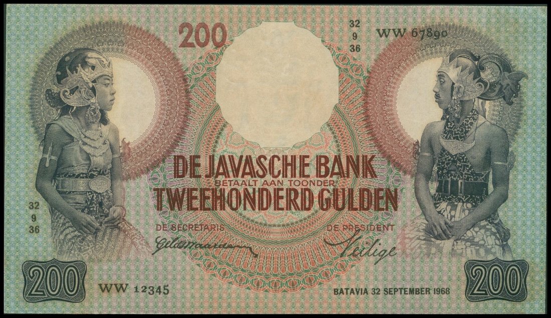 Netherland Indies, 200 gulden, 1936, specimen proof, Javanese dancers at left and right, multicolour colour,
