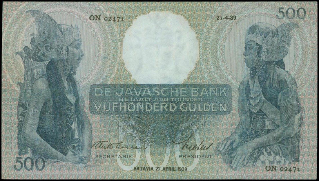 Netherlands Indies, Javasche Bank, 500 gulden, 27.4.1939, serial number ON 02471, the famous 'Wayang' series depicting Javanese dancers left and right, blue on green and light brown. watermark at top centre, reverse brown and muticoloured, text in four different scripts,