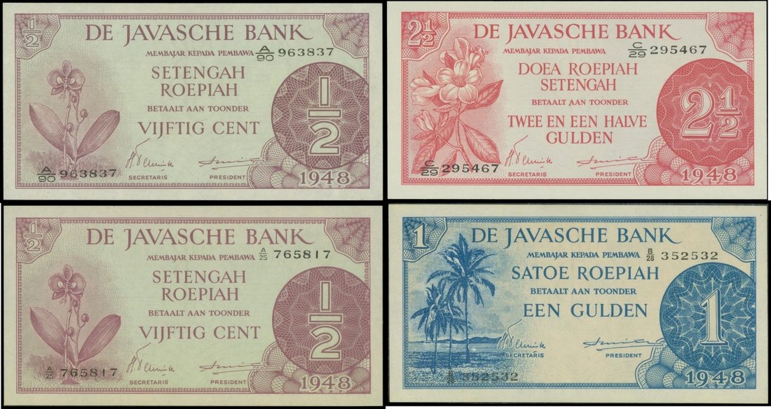 Netherlands Indies, Javasche Bank, a set of 4 notes, 2x 1/2 gulden, one gulden and 2.5 gulden, 1948, varying prefix and serial number, purple, blue and red, plantation at left, flower or palm trees at left, the 1/2 gulder notes are of different prefix types,
