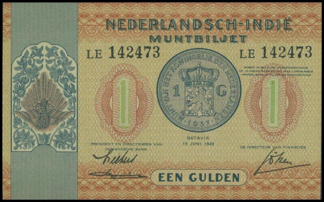 Netherlands Indies, Muntbiljet, 1 gulden, 1940, black serial LE142473, orange and multicoloured, a gulden coin at centre, Borobudur temple on reverse,