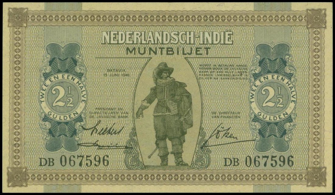 Netherlands Indies, Muntbiljet, 2.5 gulden, 15.6.1940, black serial DB067596, brown and blue, Jan Pieterszoon Coen at centre, Arms on reverse,