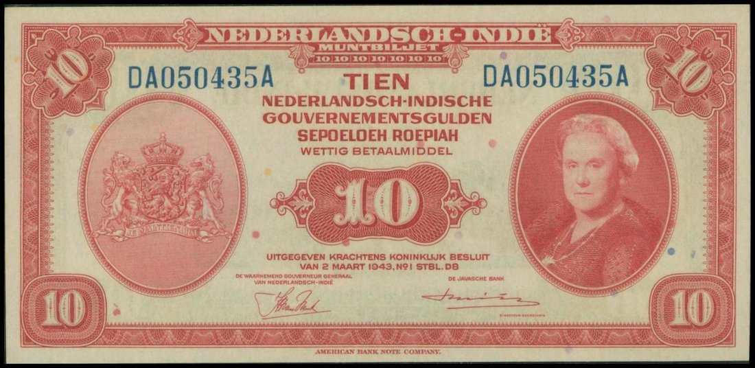 Netherlands Indies, 10 gulden, 1943, blue serial DA050435A, red, Arms at left, Queen Wilhelmina at right, Japanese plane, soldier and warship on reverse,