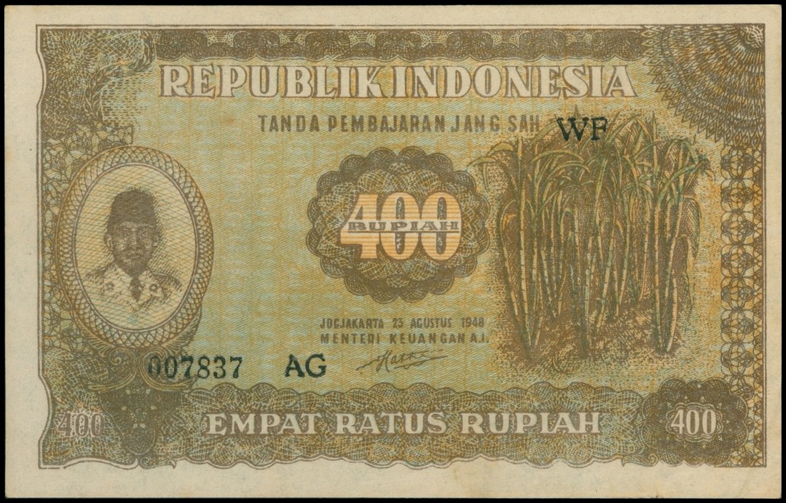 Indonesia, 400 rupiah, 1948, serial number 007837AF Block WF, brown and green, Sukarno at left, sugar cane plants at right, reverse green and brown,