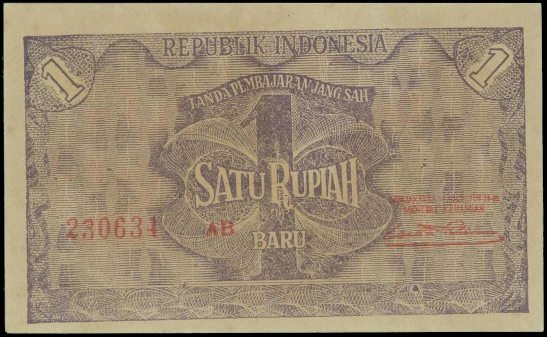 Republik Indonesia, 1 new rupiah, 1949, red serial 230634AB, purple on obverse, red on reverse, denomination at centre,
