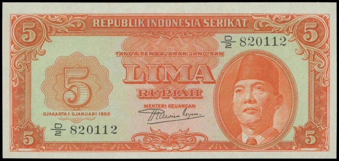 Republik Indonesia, 5 rupiah, 1950, black serial D/2 820112, orange and green, Achmed Sukarno at right, rice field on reverse,