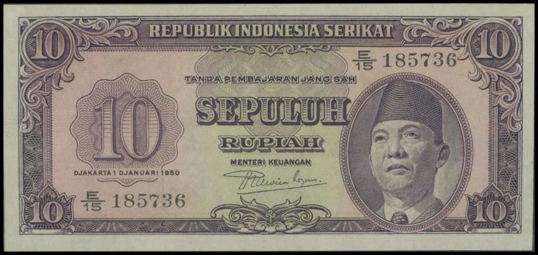 Republik Indonesia, 10 rupiah, 1950, black serial E/15 185736, purple and pink, Achmed Sukarno at right, rice field on reverse,