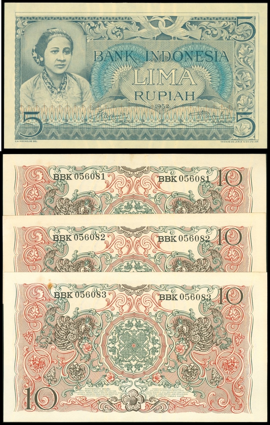 Indonesia, 5 rupiah, 1952, serial number 5ECC62176, grey-blue and blue, A. Kartini at left, floral patterns on reverse, also a consecutive run of 3x 10 rupiah, 1952, serial numbers BBK056081-083,