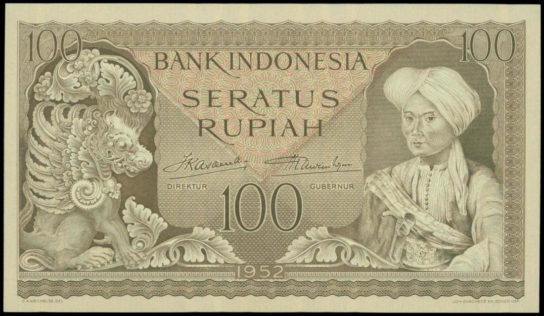Bank Indonesia, 100 rupiah, 1952, black serial UY010254, brown, green and pink, Prince Diponegoro (leader of the rebellions against the Dutch during the Java War) at right, and stylised Javanese lion at left, wing pattern and rosettes on reverse,