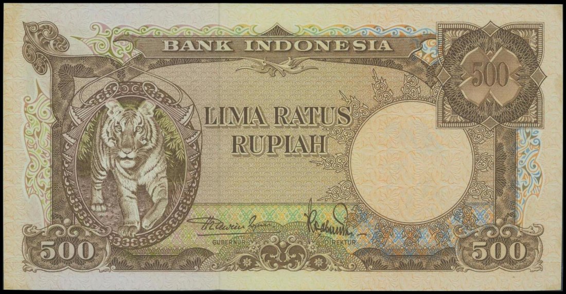 Bank Indonesia, 500 rupiah, ND(1957), black serial KV2340, brown and multicoloured, tiger at left, rice terraces on reverse,