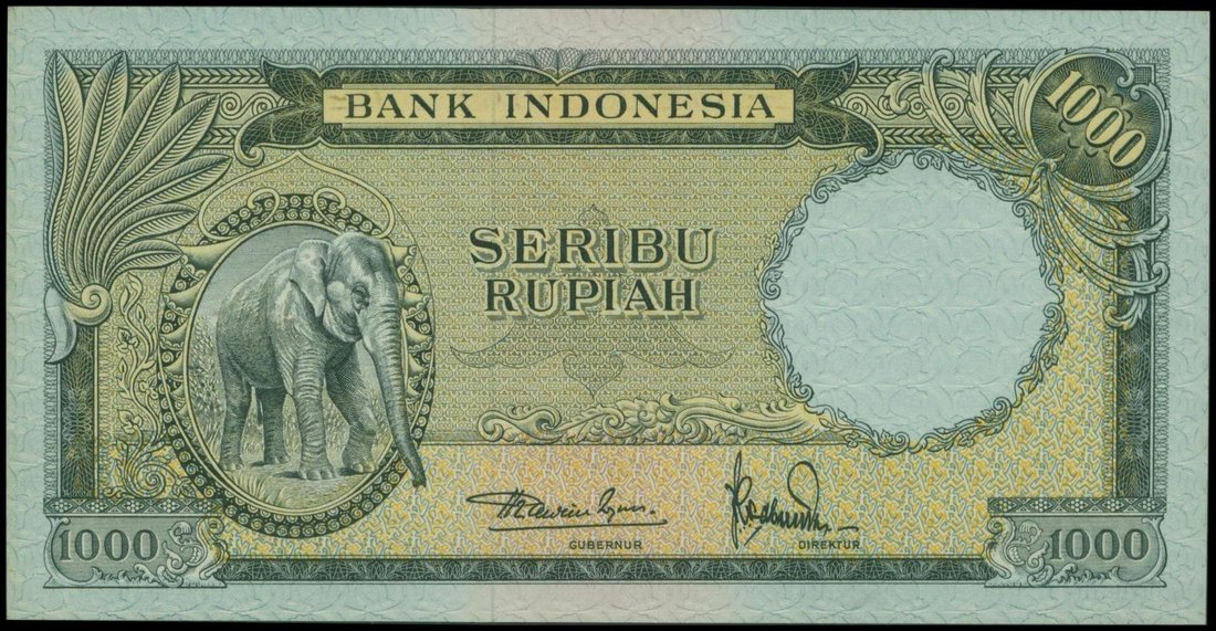 Bank Indonesia, 1000 rupiah, ND(1957), serial number TH9846, grey-blue, elephant at left, fishermen on reverse,