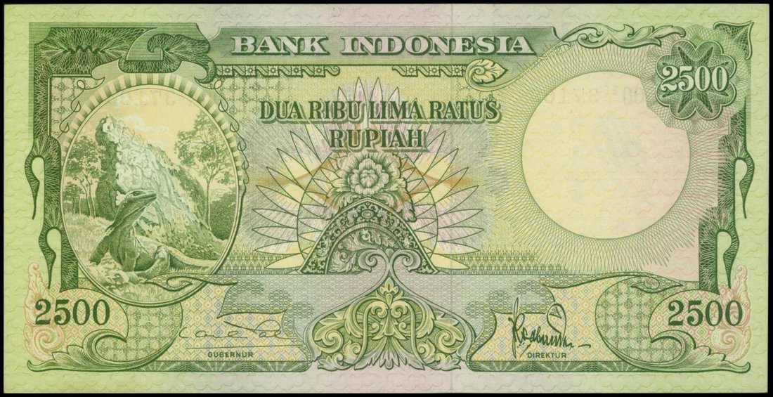 Indonesia, 2500 rupiah, 1957, serial number EE1 37163, green and multicolour, iguana lizard at left, watermark of a man with a turban at upper right, reverse blue-green, thatched huts by river,
