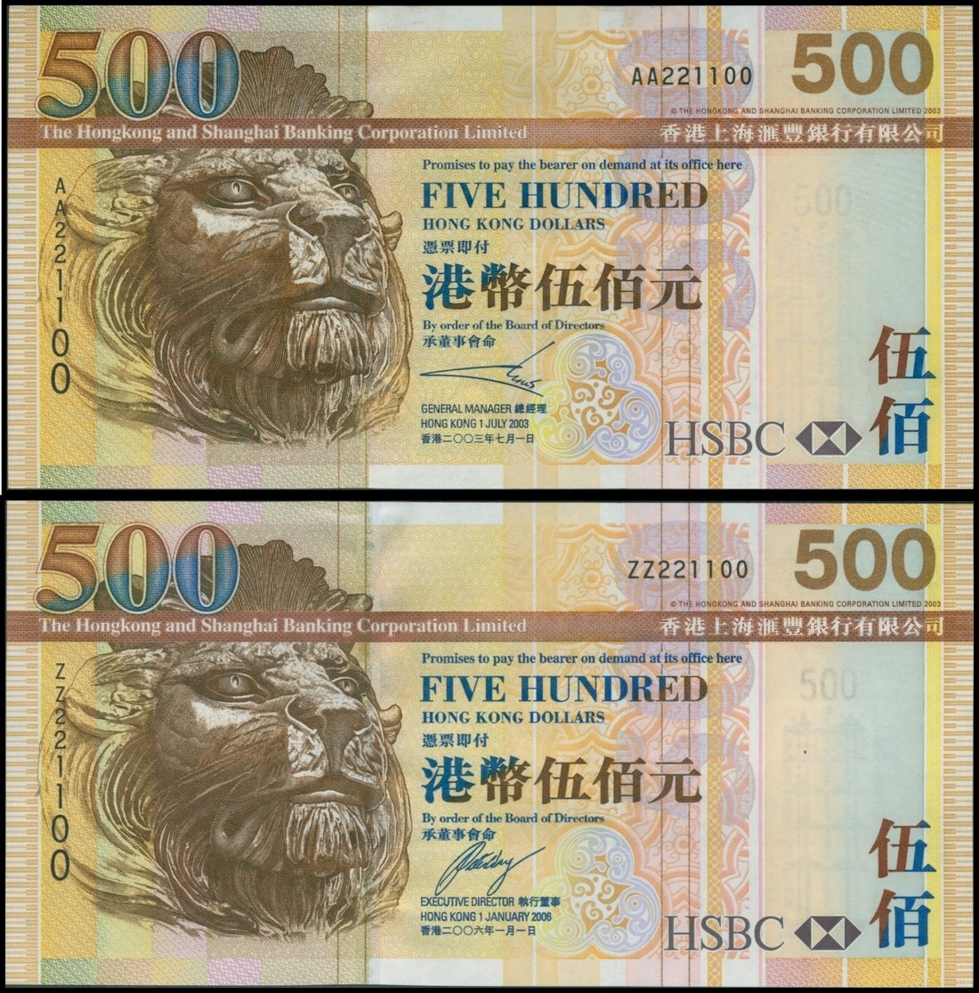 The HongKong and Shanghai Banking Corporation, a pair of $500, 2003 and 2006, serial numbers AA221100 and ZZ221100, brown and multicoloured, lion at left, reverse same colour, Hong Kong International Airport at right,