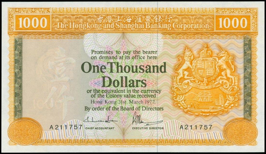 Hong kong & Shanghai Banking Corporation, $1000, 31.3.1977, serial number A211757, orange on multicolour underprint, arms at right,