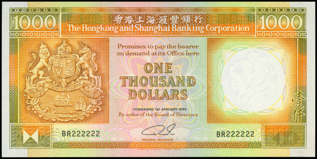 The HongKong and Shanghai Banking Corporation, $1000, 1.1.1989, lucky serial number BR222222, orange and green on multicoloured underprint, arms at left, watermark at right, reverse shows the HSBC building at centre, Supreme Court at right,