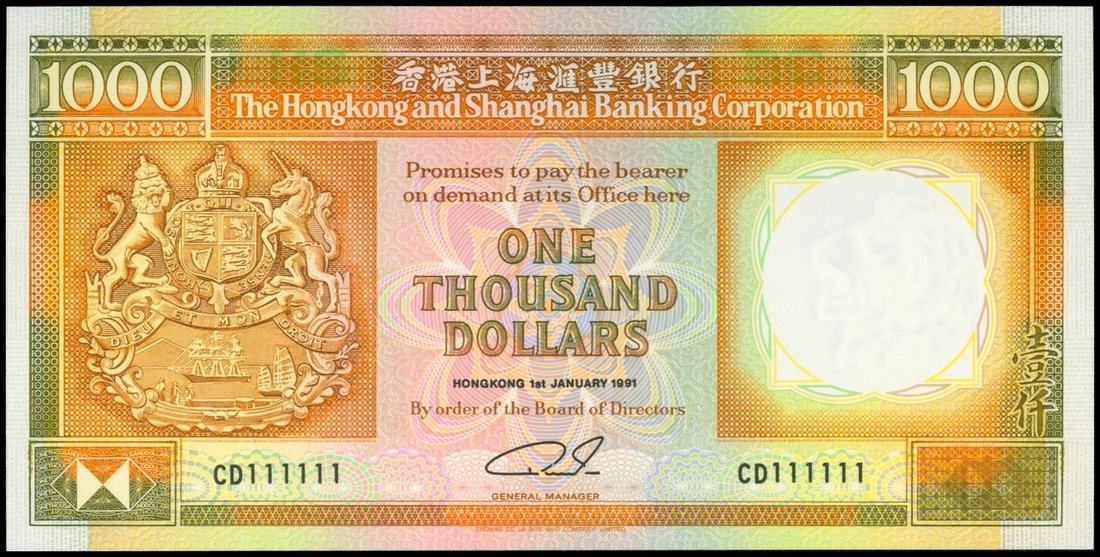 The HongKong and Shanghai Banking Corporation, $1000, 1.1.1991, lucky serial number CD11111, orange and green on multicoloured underprint, arms at left, watermark at right, reverse shows the HSBC building at centre, Supreme Court at right,