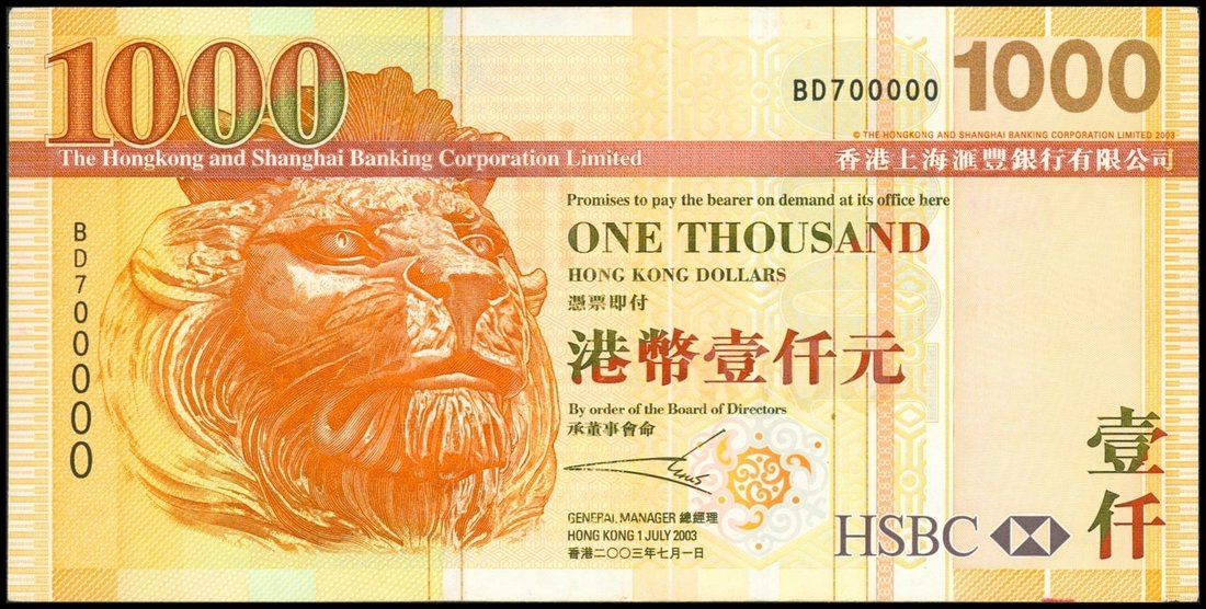 The HongKong and Shanghai Banking Corporation, $1000, 1.7.2003, serial number BD700000, yellow-orange and multicoloured, profile of a lion at left, view of Victoria Harbour on reverse, the watermark shows the HSBC building,