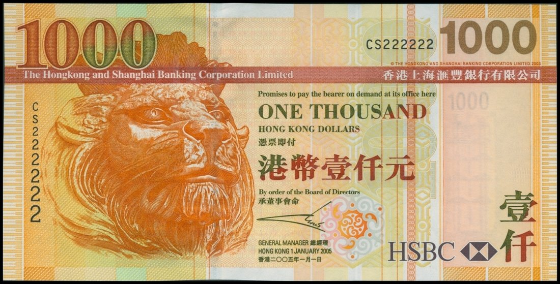 The HongKong and Shanghai Banking Corporation, $1000, 1.1.2005, solid serial number CS222222, yellow-orange and multicoloured, profile of a lion at left, view of Victoria Harbour on reverse, the watermark shows the HSBC building,
